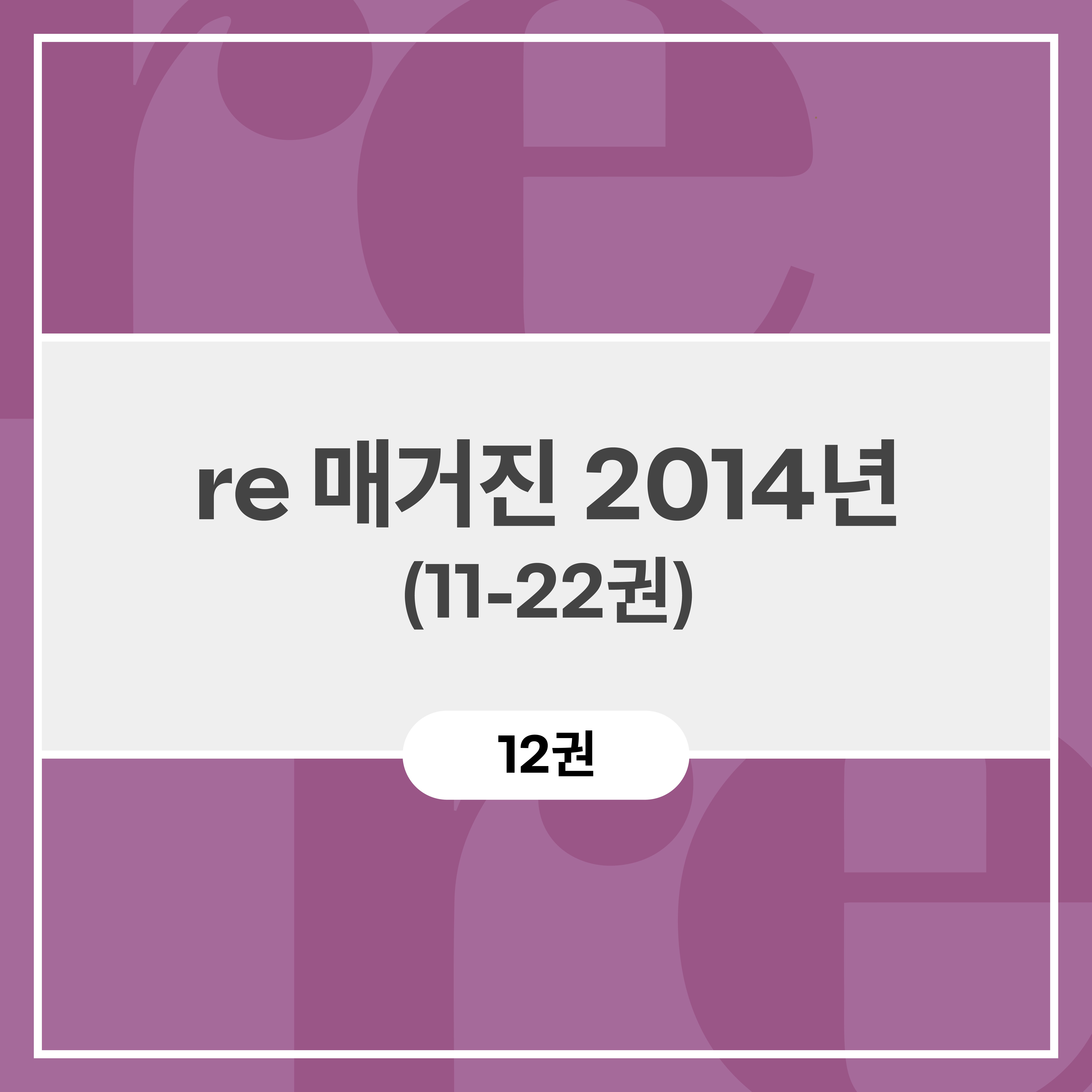 ‘다시 생각하는 그리스도인을 위한 매거진’으로 기획해 발행하는 re 매거진 2014년 11-22권으로 구성되어 있다. 그라티아 출판사는 개혁주의적 관점에서 폭넓은 기독교 사상을 경험할 수 있도록 돕는 re 매거진을 통해, 다시 깊이 생각하고 (RE-thinking), 다시 만들고 개혁하고 (REformed), 진정한 부흥을 이루고 (RErevival), 새 창조인 교회를 새롭게 하는 (REcreation) 그리스도인이 되도록, 매월 1회 re 매거진을 발행한다.
