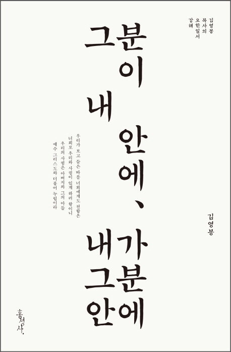 『그분이 내 안에, 내가 그분 안에』는 『사귐의 기도』로 한국 교회에 알려진 김영봉 목사의 요한일서 강해집이다. ‘그분이 내 안에, 내가 그분 안에’ 거하며 더 깊은 관계에 이르기 위해 힘쓰는 것을 ‘사귐’이라고 부른다. 저자는 ‘사귐의 영성’이 일으키는 변화를 크게 세 가지로 꼽는다. 첫 번째 변화는 죄에서 점점 멀어지고 하나님의 뜻을 따라 살게 된다는 것이다. 죄에서 멀어지는 것은 “계속하여 죄를 짓지 않는다”는 것이고, 하나님의 성품에 참여하는 자가 된다는 것이다. 두 번째 변화는 ‘사랑’이다. 사귐이 깊어지면 우리 안에 고인 그분의 사랑이 우리 영혼에 필요한 사랑의 분량을 채워 불안감과 두려움을 치유하며, 참된 사랑을 알고 실천하게 한다. 세 번째 변화는 ‘세상에 대한 승리’이다. 세상보다 강하고 더 크신 분과 사귐이 깊어질 때 우리는 어떤 일에도 흔들리지 않고 하나님의 뜻을 따라 살게 됨으로 세상을 이기게 된다. 본서는 총 3부로 구성되어 있다. 제1부 ‘그분을…’에서는 우리가 믿는 ‘그분’이 어떤 분인지를 살피고, 그분을 알아가려는 열망이 우리에게 있는지 돌아본다. 제2부 ‘그분 안에…’에서는 ‘그분 안에 거하는 것’이 어떤 것인지 다루며, 주님과의 사귐에 얼마만큼 비중을 두고 있는지 묻는다. 제3부 ‘그분처럼…’은 ‘사귐의 영성’이 우리에게 일으키는 변화를 정리한 후 우리에게 사귐의 증거가 드러나고 있는지 스스로 살피게 한다.